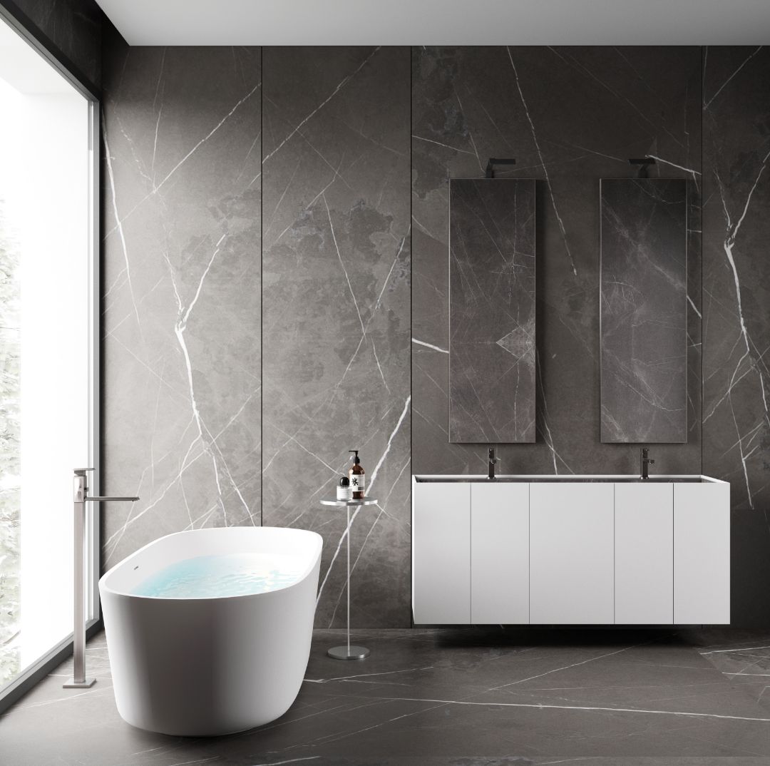 и пол ванных комнат выложен мрамором Pietra Grey, установлен санфаянс Gessie